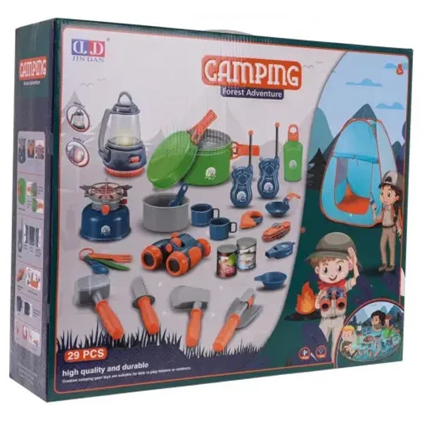 Bogato wyposażony zestaw kempingowy, namiot i akcesoria kempingowe dla dzieci od 3-go roku życia. Idealny zestaw do zabawy w pomieszczeniach i na świeżym powietrzu. Na całość składa się 29 elementów m.in. namiot, mata kempingowa, kuchenka turystyczna, latarka, lampa kempingowa, lornetka, krótkofalówki oraz narzędzia i garnki. Zestaw wykonany został z najlepszej jakości materiałów i jest w pełni bezpieczny dla dzieci. Krótkofalówki zasilane są bateriami typu 2 x 9 V (łącznie), piecyk górski zasilany jest bateriami typu 2 x AA 1,5 V, latarka bateriami typu 2 x AA 1,5 V. Baterii brak w zestawie.